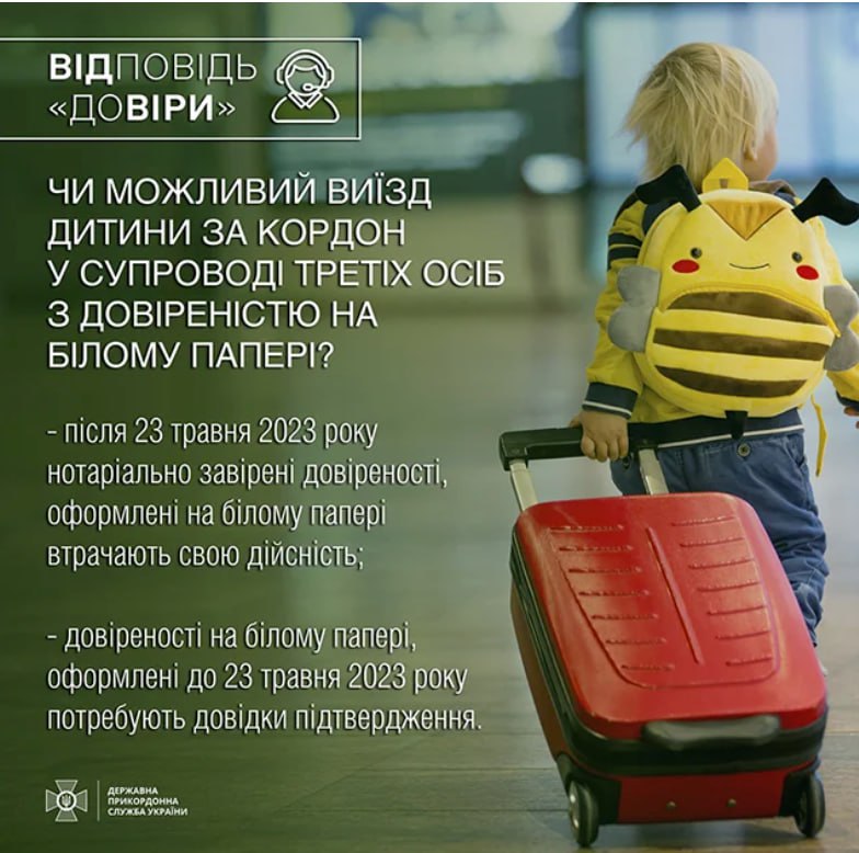 В Государственной пограничной службе Украины заявили, что недействительными считаются все бланки, которые выдавались после 23 мая Эти доверенности могут быть отклонены пограничниками, и детей с сопровождающими могут не выпустить за границу до момента получения подтверждения от нотариуса о выдачи такой доверенности.