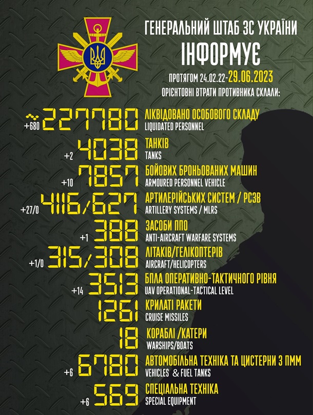 Силы обороны за минувшие сутки уничтожили 680 российских оккупантов. Общие боевые потери армии орков с начала войны ориентировочно составили 227 780 человек. Об этом сообщает Генштаб ВСУ.