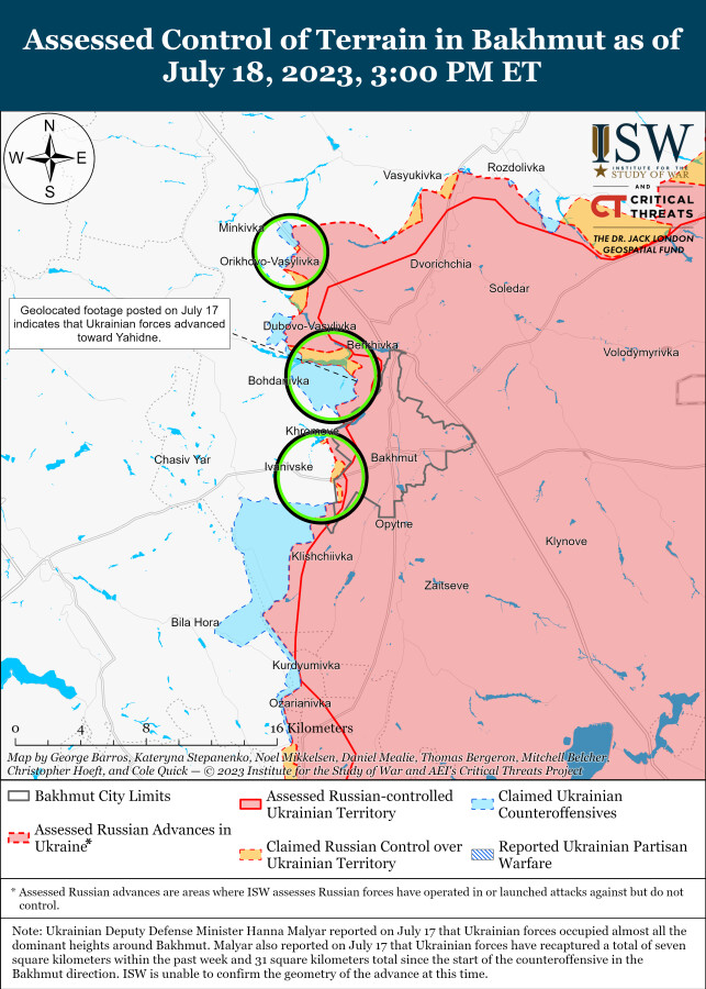 Аналитики отмечают, что на 18 июля Силы обороны продолжали контрнаступательные действия в районе Бахмута и продвигались к северу от города. Геолокационные кадры за 17 июля показывают, что украинские войска продвигались к западу от Ягодного, что в трех километрах северо-западнее Бахмута.