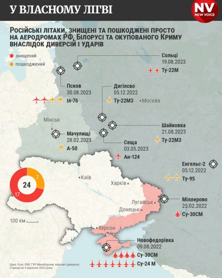 – Знищення 5 літаків за три дні на російських аеродромах Шайковка і Сольці