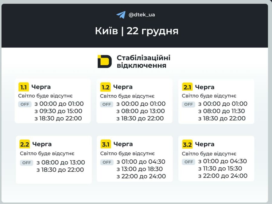 ВІЙНА В Україні Оновлені графіки відключень електроенергії в Києві на 22 грудня