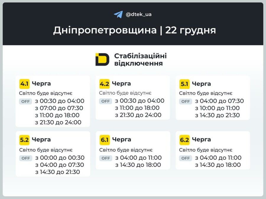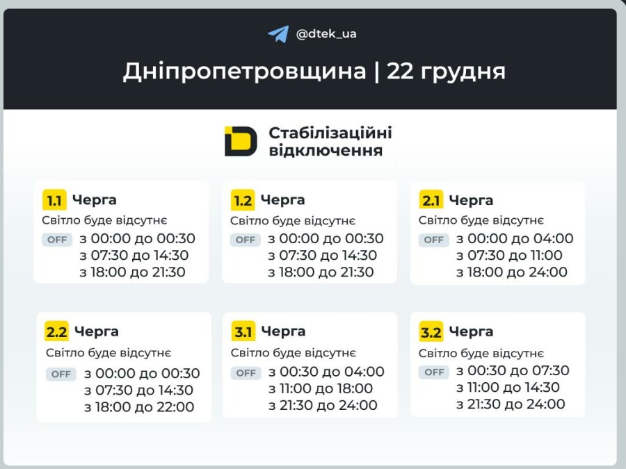 ВІЙНА В Україні Графік відключень світла на 22 грудня у Дніпрі та Дніпропетровській області