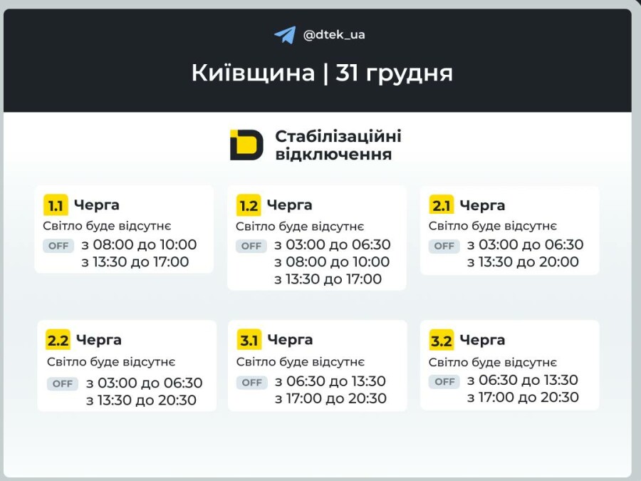 ВІЙНА В Україні Київська область: оновлені графіки відключень електроенергії на 31 грудня
