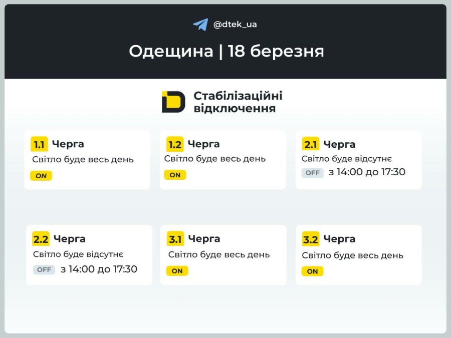 ВІЙНА В Україні Одещина: за командою Укренерго застосовано графіки відключень на 18 березня
