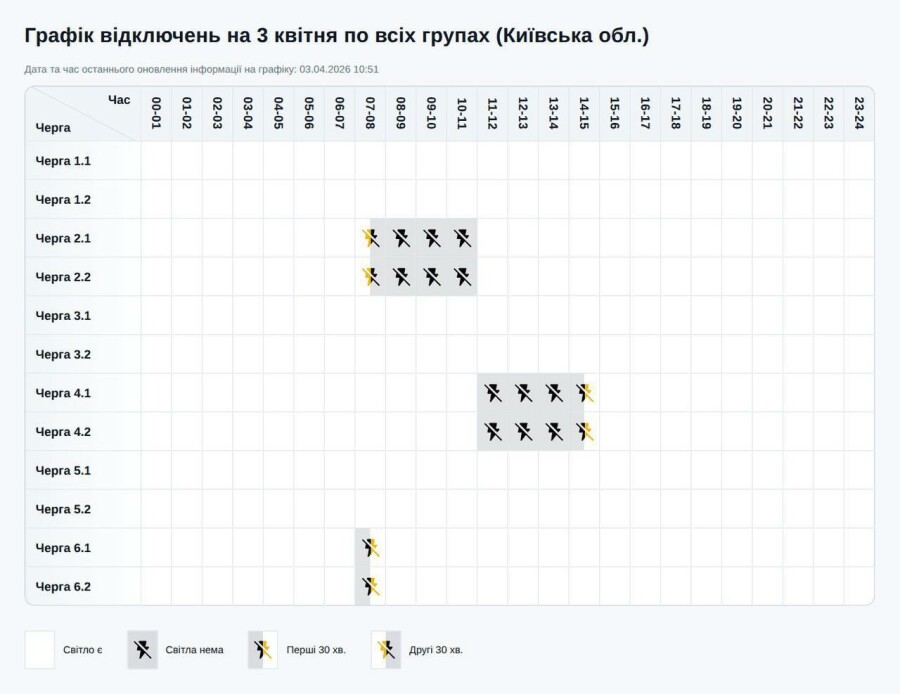 ВІЙНА В Україні Київська область: оновлені графіки погодинних відключень світла на 3 квітня
