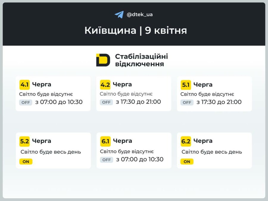На Київщині протягом доби, за розпорядженням НЕК "Укренерго", задіяно графік відключення. Він може змінюватися!