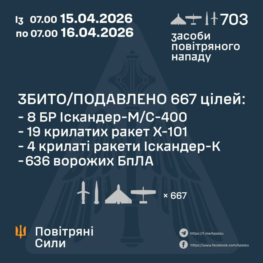 Збито або подавлено 667 повітряних цілей: 31 ракету та 636 БПЛА.