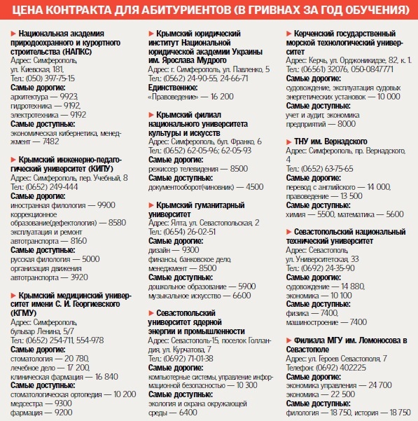В этом печальном случае есть утешительная новость — дорожать обучение по сравнению с 2012 годом не будет. Практически все ведущие вузы работают по старым ставкам, правда, в приемных комиссиях оговариваются, что еще возможны незначительные изменения до 20 июня. Уже сегодня прогнозируется наплыв студентов — в прошлом году был недобор из-за демографической «ямы» поколения начала 90-х.Прекратил свое существование один из крымских гигантов — Таврический гуманитарно-экологический институт, и его сосед-конкурент — Крымский инженерно-педагогический университет — сразу же отреагировал открытием новых факультетов: «У нас появился факультет журналистики, и можно получить степень бакалавра. Год обучения будет стоит 9 тысяч грн. По другим нашим специальностям повышения цен не будет, а для заочников даже будет снижение.
