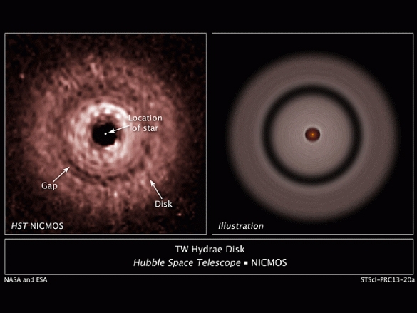 Астрономы не могут объяснить новое открытие Хаббла - телескоп NASA обнаружил планету, условия формирования которой не укладываются в рамки современной науки. Ученые наблюдали за звездой звездой TW Гидры, которую отделяет от Земли расстояние в 176 световых лет.