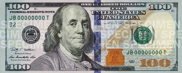 Тогда на 100-долларовой бумажке появился новый портрет Бенджамина Франклина, а сама купюра "заиграла" новыми красками и цветами. В последние годы вносились изменения в дизайн купюр достоинством в 5, 10, 20 и 50 долларов.
