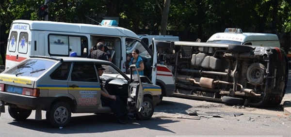 Сегодня в центре Николаева произошло столкновение автомобилей ВАЗ 2109, принадлежащий милицейской службе охраны «Титан» и микроавтобуса Hyundai. В результате столкновения микроавтобус перевернулся, несколько человек были травмированы.
