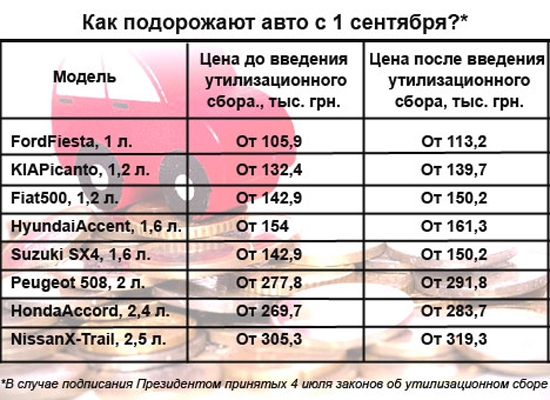 Если утилизационные законы вступят в силу, уже этой осенью все покупатели новых иномарок начнут платить из своего кармана новый экологический налог. «Импортеры самостоятельно не смогут компенсировать это повышение, и в итоге пострадает конечный потребитель. Таким образом, утилизационный сбор будет взиматься со всех автомобилей, зарегистрированных после 1 сентября 2013 года», — заявляет пресс-служба компании «Хонда Украина». Согласно прогнозам, розничная цена на новые авто увеличится пропорционально взимаемому сбору. «Насчет подорожания, думаю, розничные цены могут увеличиться на идентичные утилизационным коэффициентам суммы», — говорит начальник отдела связей с общественностью компании «Ниссан Мотор Украина» Владимир Иванов.