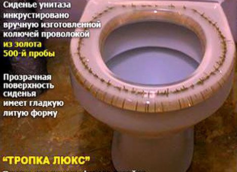 В Украине можно купить унитаз, прозрачное сидение которого инкрустировано вручную изготовленной колючей проволокой. Последняя, как утверждают производители, сделана из золота 500-й пробы.