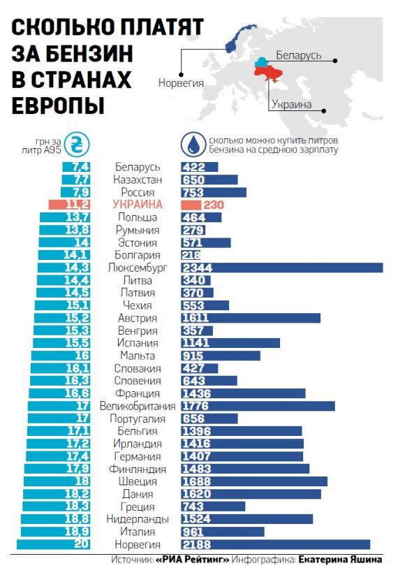 Самое дешевое топливо — у стран, входящих в Таможенный союз. Самое дорогое — в Норвегии, и это несмотря на то, что страна — один из главных добытчиков нефти в регионе. А среди стран Евросоюза самый дорогой бензин в Италии. Украина дороже стран ТС, но дешевле остальной Европы. Но при этом мы с Болгарией и Румынией вошли в тройку стран, жители которых за свою зарплату могут позволить себе купить меньше всего бензина (см. графику).
