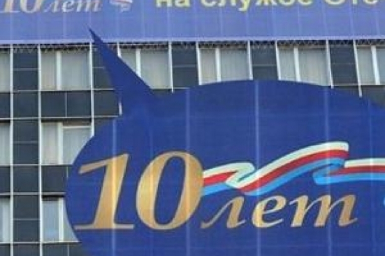 На снимках видно, что авторы баннера "Десять лет на службе Отечеству" поменяли местами две полосы российского триколора. В результате красная полоса, которая должна была быть снизу, оказалась посередине, а ее место заняла синяя. Современного флага аналогичной расцветки "Ленте.ру" в справочниках найти не удалось.