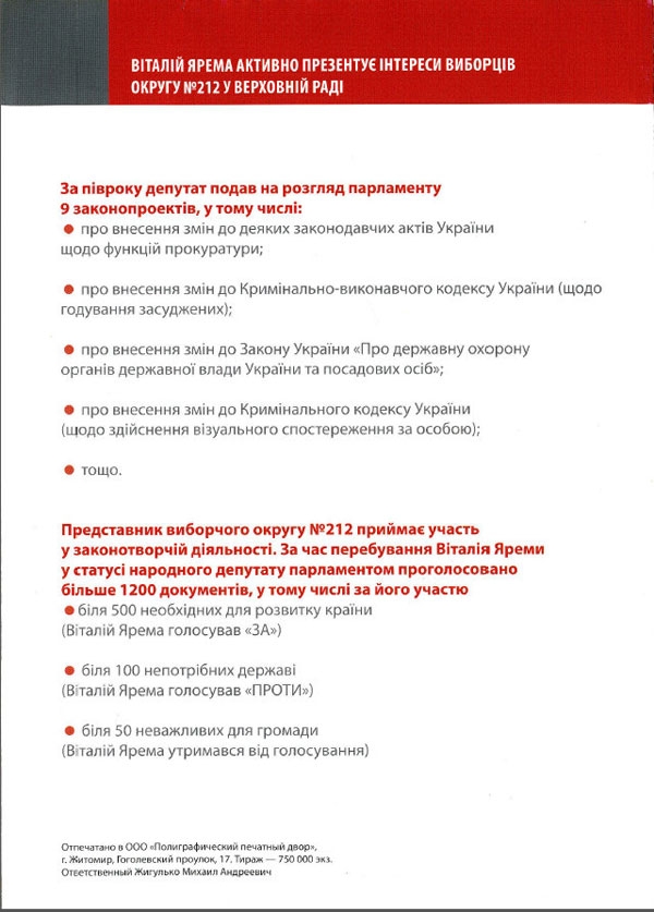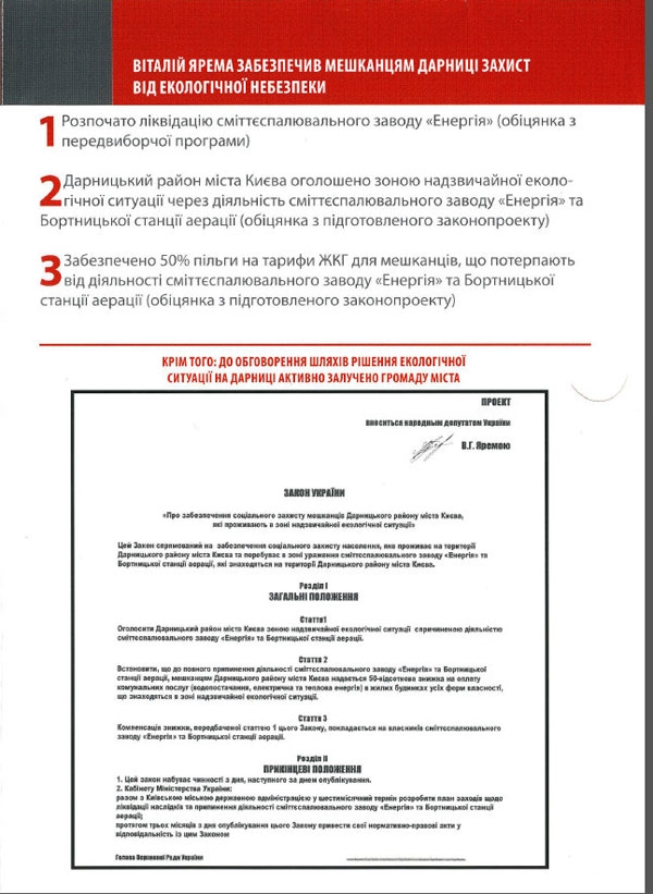 И, наконец, в распространяемой штабом политика листовке утверждается, что Виталий Ярема уже внес на рассмотрение Верховной Рады законопроект об объявлении Дарницкого района Киева зоной чрезвычайной экологической ситуации, а также о предоставлении в связи с этим жителям района 50% скидки на оплату коммунальных услуг. В то же время, как сообщили в секретариате парламента, такая законодательная инициатива на рассмотрение депутатского корпуса не поступала.
