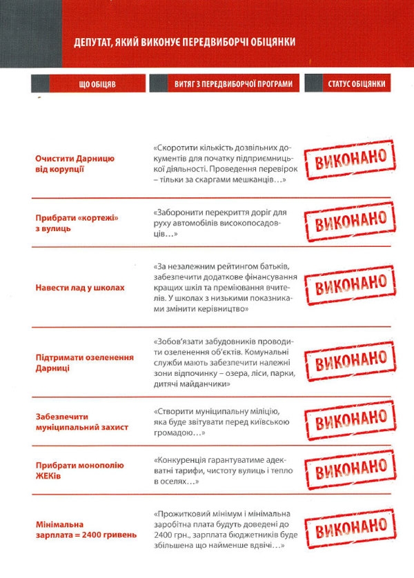 Более того, если верить агитке, в Киеве уже появилась муниципальная милиция. "Обещание: создать муниципальную милицию, которая будет подотчетна перед киевской общиной - выполнено", - утверждает депутат. Как известно, что инициатива о создании муниципальной милиции была озвучена нынешним летом руководителями столичной администрации, но позже глава КГГА Александр Попов заявил, что муниципальная милиция пока остается только в планах.