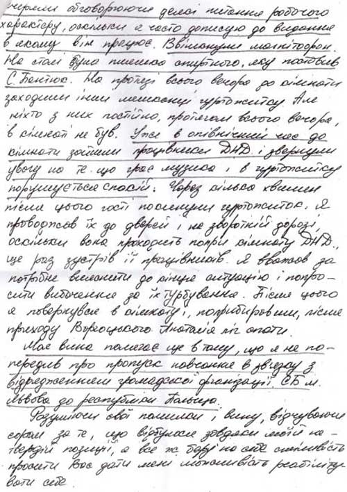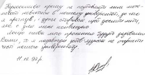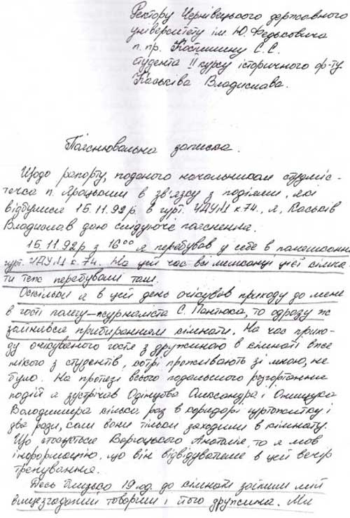 Руководство Черновицкого национального университета им. Ю. Федьковича в ответ на мое обращение направило копию пояснительной записки студента 2-го курса исторического факультета Владислава Каськива, написанную им в декабре 1992 года", - сообщает пресс-служба депутата.