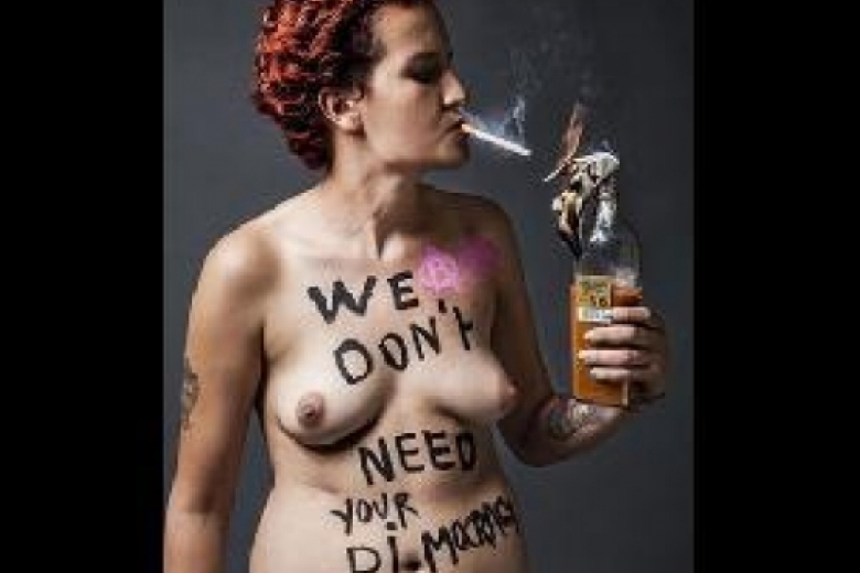 В сообщении Амина по традиции движения сфотографирована обнаженной по пояс. Она прикуривает от бутылки с "коктейлем Молотова". Надпись на английском языке на ее теле гласит: "Нам не нужна ваша демократия". При этом Амина использует искаженное насмешливое написание - "di-mocracy".