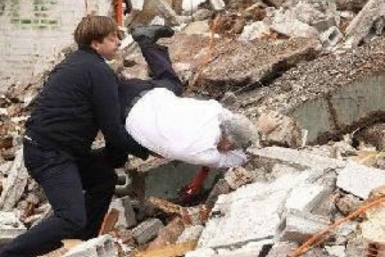 Предотвратить падение президента безуспешно пытался глава местной районной администрации. На фото видно, что Пиньера в падении достаточно серьезно ударился головой об обломки здания.