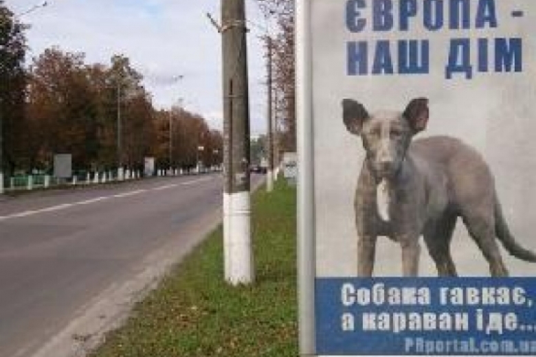 На уличной рекламе, которая размещена в центре города, изображена собака, сходство которой с президентом РФ Владимиром Путиным обсуждали недавно в сети. Авторы небольшого борда поддерживают интеграцию Украины в Евросоюз. При этом они отказываются учитывать реакцию России. «Европа - наш дом.