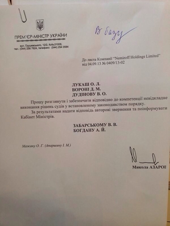 Ранее, 4 сентября 2013 года премьер-министр Украины Николай Азаров направил официальное распоряжение с требованием незамедлительно выполнить все судебные решения, в том числе решения Высшего хозяйственного суда, Высшего административного суда Украины и открытые испольнительные производства о внесении в государственный реестр записи о смене генерального директора ДП УВК Nemiroff.