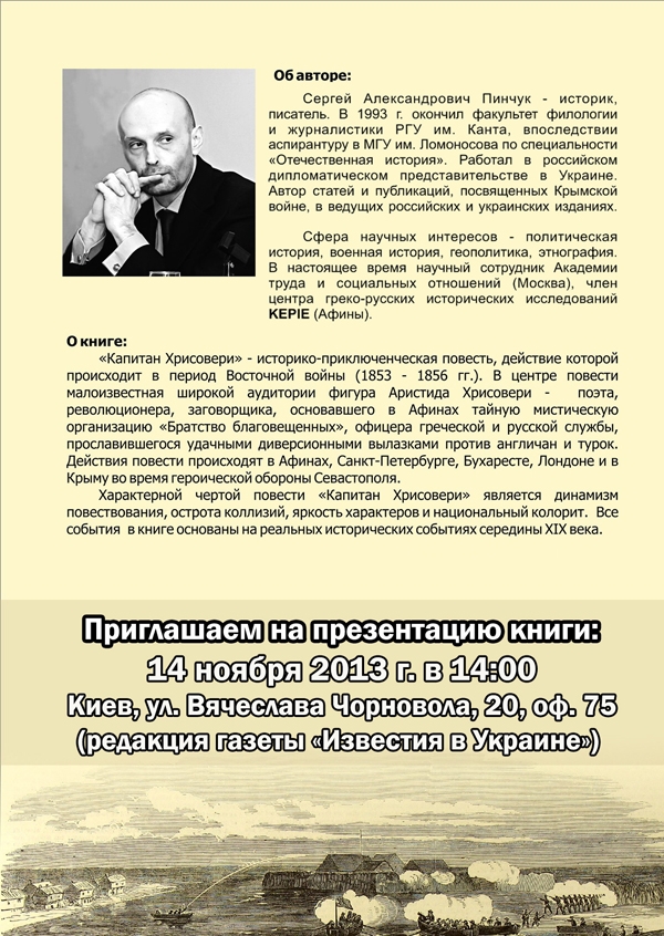 14.11.2013. в 14:00 состоится презентация книги дипломата, историка, писателя Сергея Пинчука «Капитан Хрисовери», посвященная революционеру, заговорщику и диверсанту, действовавшего в Афинах, Санкт-Петербурге, Лондоне и Крыму.