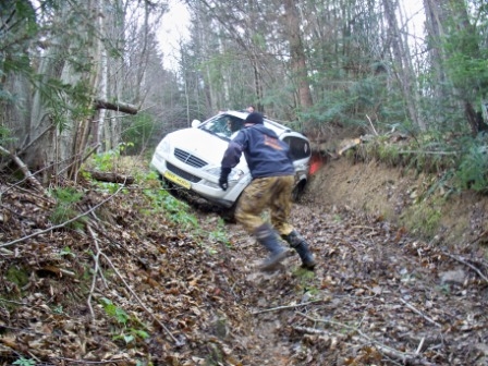 Трудно представить, как это выглядит, а в особенности понять, как это стоять в лесу в компании 30 человек и вручную выталкивать машины. Наверное, именно тут и зарождается дружба, впоследствии толкающая людей на такие путешествия и вселяющая уверенность в человеке рядом. Пробирались по лесу мы около трех часов, постоянно очищая дорогу от бревен, веток и камней. Не раз приходилось выталкивать машину из грязи или колеи, из которой не по силам было выкарабкаться в одиночку. Кому-то покажется, что все это лишь развлечение, но что сказали бы на это местные жители, для которых наши приключения являются помощью, ведь мы, таким образом, расчищаем дороги и уменьшаем шансы людей намертво застрять в лесу, где не редкость появление волков. «Мы пользовались относительно основными дорогами, которым по 50—100 лет и смогли их хоть как-то расчистить, чтобы люди могли более или менее ими пользоваться», — сказал «Известиям в Украине» Дмитрий Ковалев президент клуба внедорожных приключений.