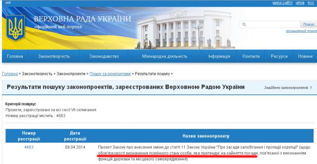Согласно законопроекту № 4663, который был зарегистрирован 9 апреля, к статье 11 Закона Украины "Об основах предотвращения и противодействия коррупции" должно быть внесено изменение, относительно обязательности определения психического состояния лица, которое претендует на занятие должности, связанной с выполнением функций государства и местного самоуправления.