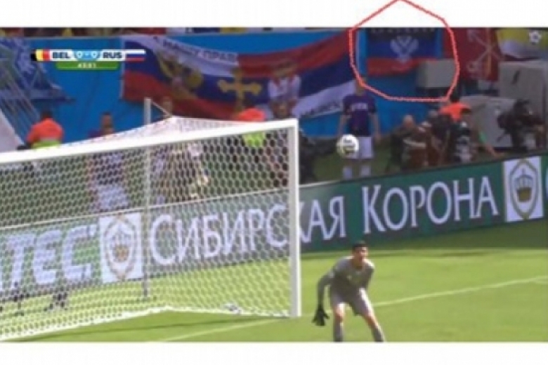 Болельщики сборной России, которые пришли на матч второго раунда группового этапа , где их команда играла со сборной Бельгии, вывесили флаг непризнанной ДНР. Это заметно на стоп-кадре после удара Александра Кокорина.