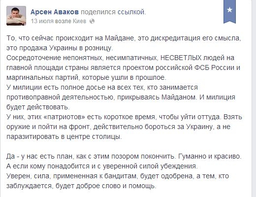 «То, что сейчас происходит на Майдане, это, это продажа Украины в розницу. Сосредоточение непонятных, несимпатичных, НЕСВЕТЛЫХ людей на главной площади страны является проектом российской ФСБ России и маргинальных партий, которые ушли в прошлое.