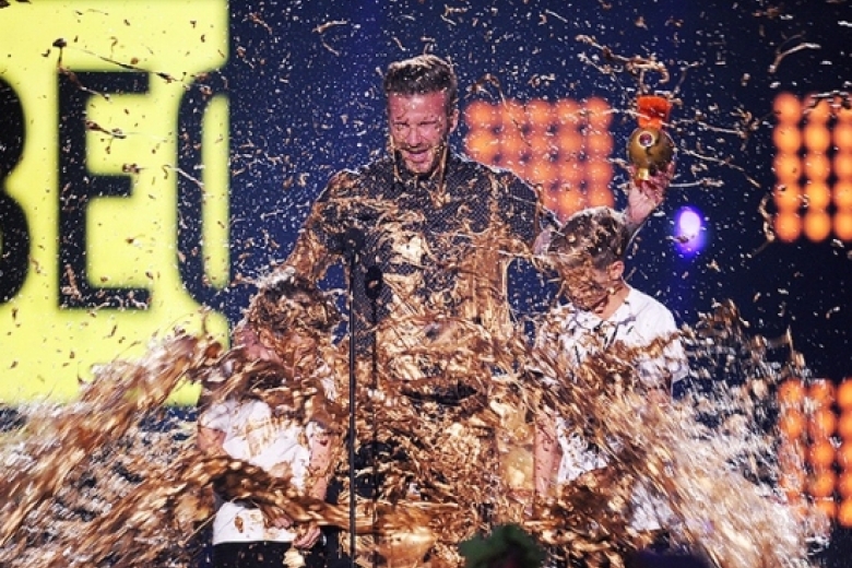 Это произошло во время церемонии вручения премии Кids Choice Sports Awards от телеканала Nickelodeon, что позвонило Дэвиду, Ромео и Крузу почувствовать себя золотыми статуэтками. Изначально такой сюрприз предназначался только старшему из Бэкхемов, но дети решили подняться на сцену с ним. Обливание ничуть не разозлило отца, он вместе с сыновьями от души веселился, пока на с них ручьями стекала золотая краска. А вообще Дэвиду и его сыновьям даже повезло – на других церемониях знаменитостям доставался душ из зеленой слизи.