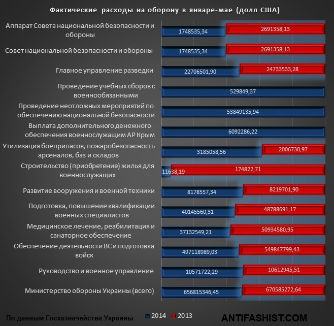 Если сравнить фактические расходы военного бюджета в январе-мае 2013 года и сопоставить с расходами за аналогичный период 2014 года, то получается, что в первом полугодии 2014 года Украина потратила на армию меньше, чем в мирное время.