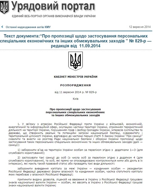 Это следует из обнародованного Кабмином распоряжения украинского правительства №829-р от 11 сентября 2014 года О предложениях по применению персональных специальных экономических и других ограничительных мер, обнародованном на правительственном сайте в пятницу, 12 сентября.