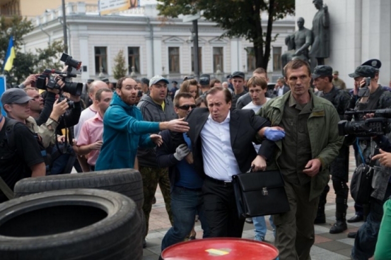 Возмущенная толпа около Верховной Рады сегодня поймала и бросила в мусорный бак народного депутата Журавского. К слову ранее мусорного контейнера у стен парламента не было, его накануне происшествия специально подвезли члены Правого сектора.