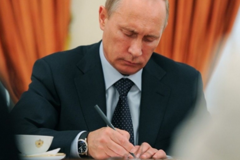 По замыслу мастера, кукла-Путин сидит за столом и подписывает документ об аннексии Крыма - Договор между Российской Федерацией и Республикой Крым о принятии АРК в состав РФ.