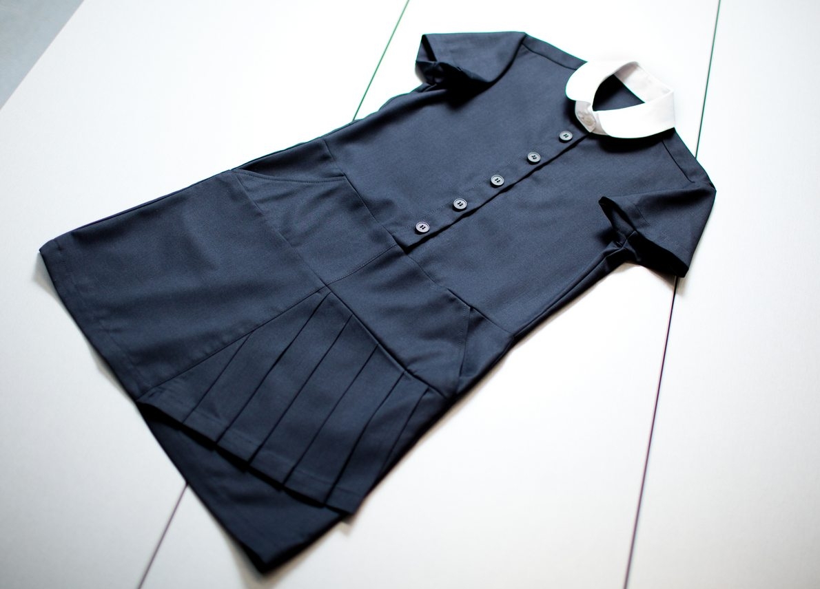 Наряд имеет оригинальный дизайн. Особого внимание в данной модели заслуживает стильная юбка. Ее интересный покрой, несомненно, придется по душе юной моднице. Не обошлось в дизайнерском исполнении и без классического элемента. В нашем случае эту роль выполняет строгий отложной воротник белого цвета. Он превосходно сочетается с основным тоном изделия. А в плане цветового решения наряд представлен в двух вариантах: черном и темно-синем.