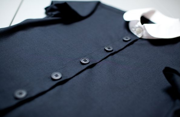 Белый отложной воротник на стойке смотрится невероятно стильно. Если Вы захотите дополнить образ каким-нибудь оригинальным аксессуаром, то сможете без труда повязать ленту или шейный шнурок. Под воротником выполнена прямая застежка на черных пуговицах, которая в области юбки переходит в центральную строчку. На самом воротнике так же имеется застежка на белую пуговицу. Рукава у платья – прямые и короткие.