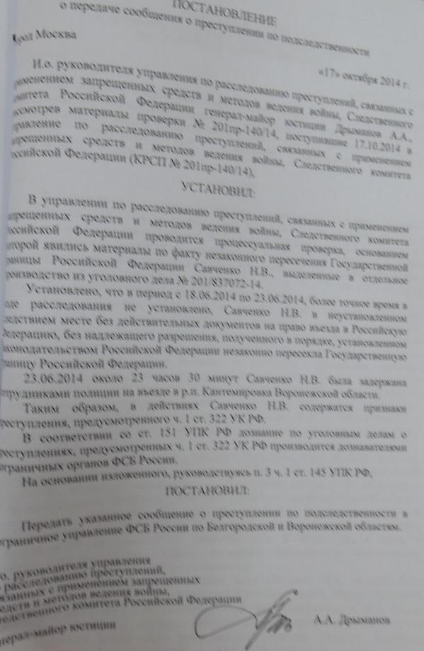 Фото документа, а именно сообщения о преступлении, опубликовано в твиттере другого ее адвоката Николая Полозова. В этом документе говорится, что Савченко незаконно пересекла границу России.