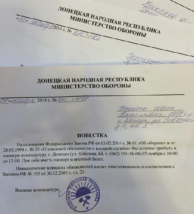 Лубкивский сообщил, что на сегодня изготовлено и доставлено на контролируемые боевиками территории более 30 тысяч повесток, вручаемых лицам призывного возраста. "За отказ явиться в призывные пункты молодые люди будут наказываться согласно российскому законодательству ", - отметил он.