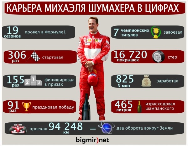В главных гонках мира Михаэль Шумахер провел 19 сезонов, принял участие в 300 этапах Гран-при, 155 из которых завершались для него призовыми местами. На его счету 91 победа, 68 поул-позишн, 77 лучших кругов. В целов он выигрывал почти каждую третью гонку в скоей карьере, потому заслужено получил 7 чемпионских титулов и стал легендой Формулы-1.