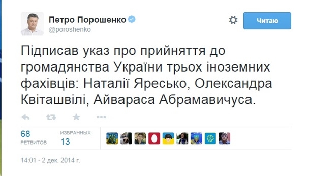 "Мы нашли людей, и сегодня они готовы стать гражданами Украины. Поэтому я подписал указ о принятии в гражданство Украины трех высокопрофессиональных иностранных специалистов: Натальи Яресько, Александра Квиташвили, Айвараса Абрамавичуса. Вместе победим!" – написал Порошенко.