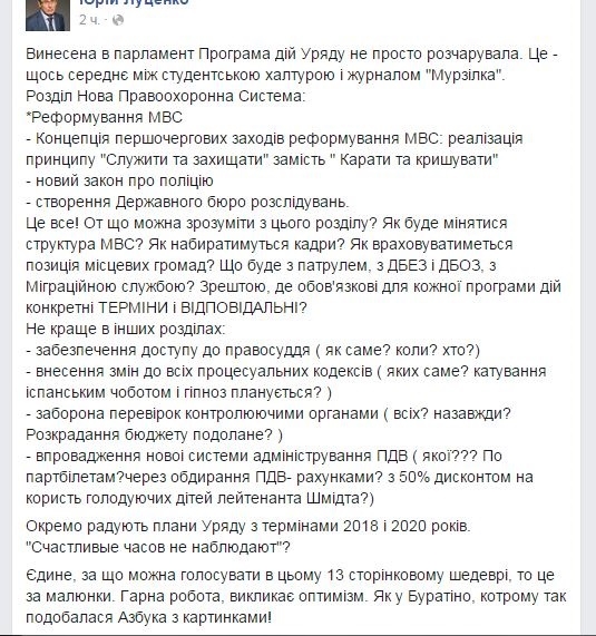 "Вынесенная в парламент программа действий правительства не просто разочаровала. Это - что-то среднее между студенческой халтурой и журналом "Мурзилка", - считает Луценко. Политика возмутило отсутствие конкретики в целом ряде направлений, в частности, - в реформировании МВД, судебной и налоговой системах. "Единственное, за что можно голосовать в этом 13 страничном шедевре, так это за рисунки. Хорошая работа, вызывает оптимизм. Как у Буратино, которому так нравилась Азбука с картинками!" - написал Луценко.