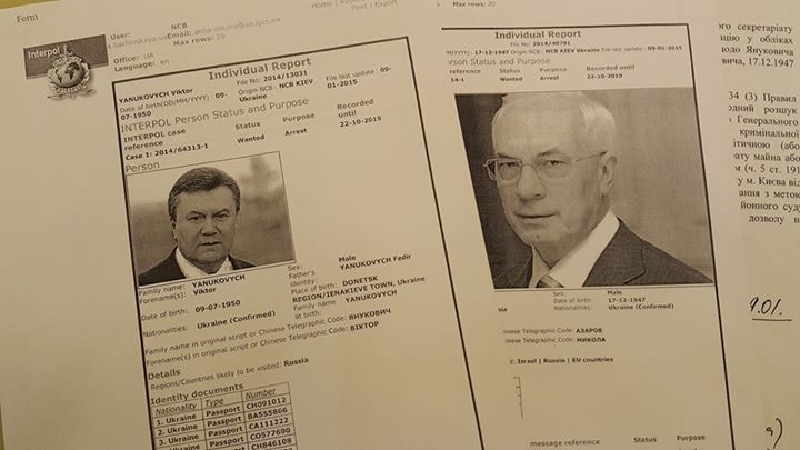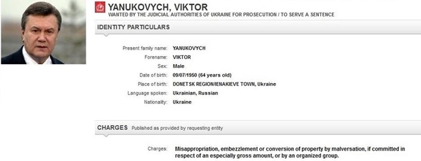 Объявлены в международный розыск Интерпола ( красная карточка -задержание для экстрадиции в Украину): Янукович Виктор Федорович, Янукович Александр Викторович, Азаров Николай Янович, Багатырева Раиса Васильевна, Колобов Ю. В. ( экс министр финансов Украины), Дзекон Г.Б. ( экс руководитель Укртелекома).