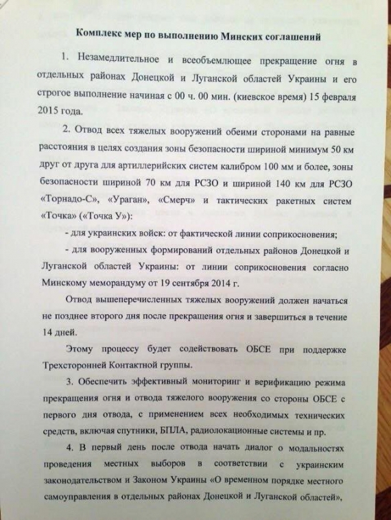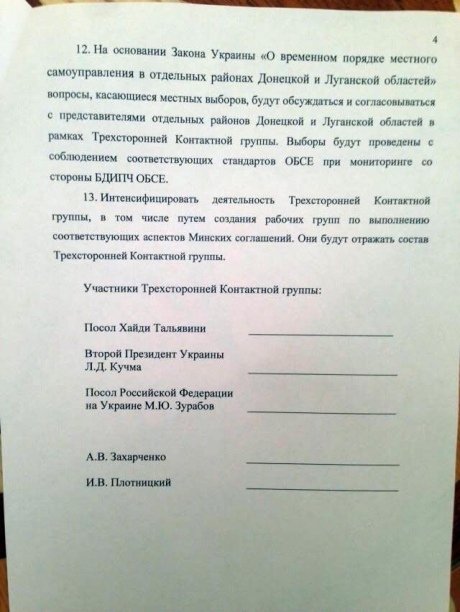 В Сеть попал документ, который стороны подписали в Минске. Он состоит всего из 13 пунктов, которые должны прекратить войну на Донбассе