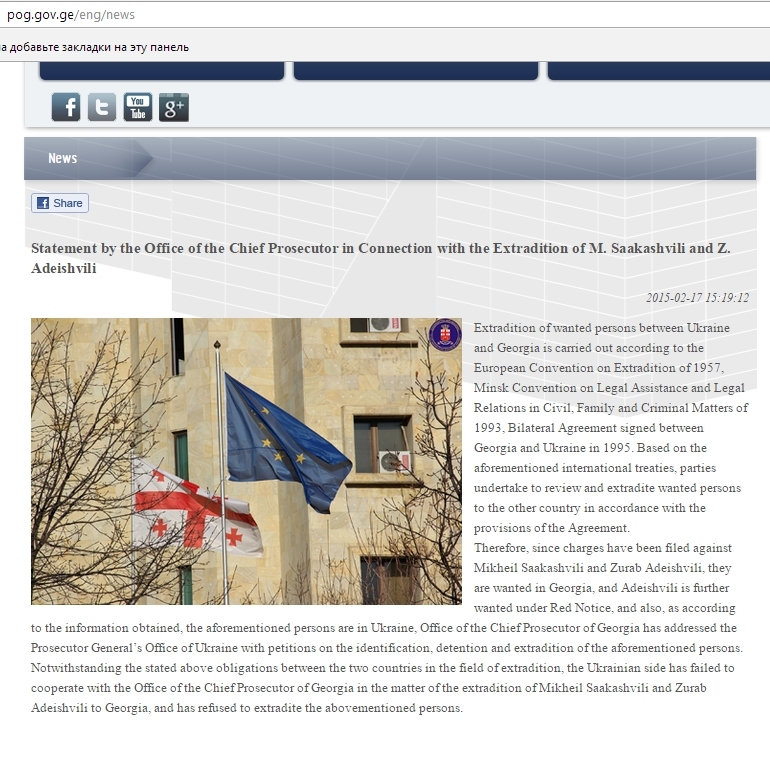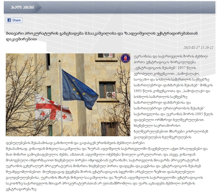 "Несмотря на существующие между странами в сфере экстрадиции обязательства, украинская сторона по вопросу экстрадиции Саакашвили и Адеишвили не сотрудничала с прокуратурой Грузии и отказывается экстрадировать разыскиваемых лиц", - говорится в официальном сообщении правоохранительного ведомства Грузии.