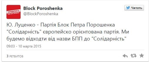 Об этом сегодня написал лидер президентской политсилы Юрий Луценко на официальной странице партии в Twitter .