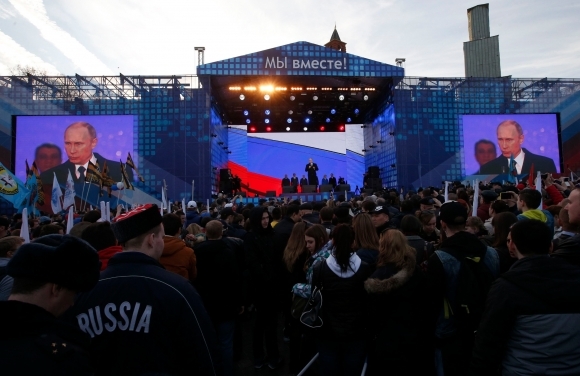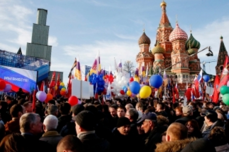 Несколько десятков тысяч россиян собрались у стен Кремля, чтобы отметить годовщину аннексии Крыма. На Васильевском спуске установлена сцена, на которой написано "Мы вместе". Участниками акции заполнены все прилегающие набережные, а также Большой Москворецкий мост, на котором 19 дней назад был убит российский политик Борис Немцов.