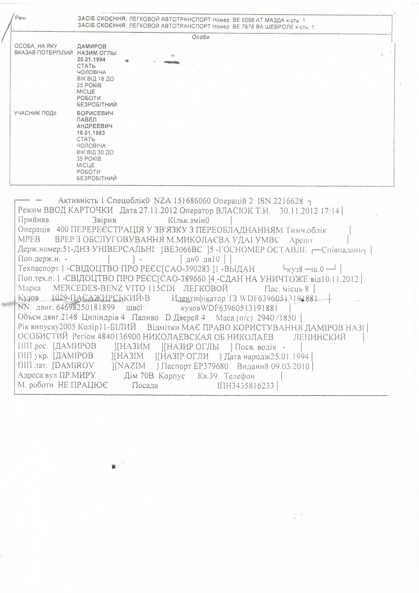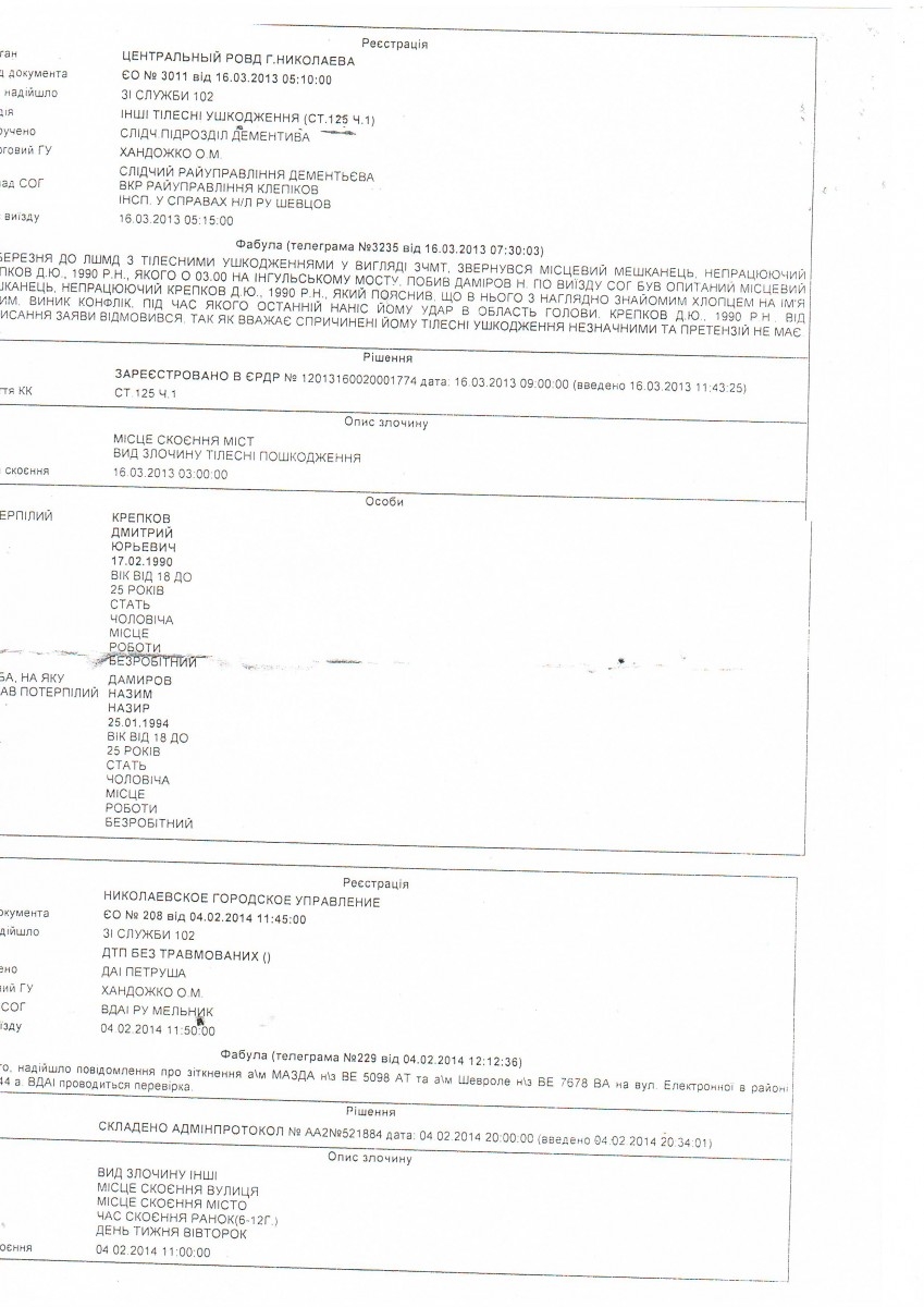 Что касается еще одного мирного «протестующего против расовой дискриминации» Дамирова Назима Назир оглы, то он судим не был. Однако, в правоохранительных органах успел «отметиться». Согласно выписки из Единого реестра досудебных расследований (№12013160020001774) Дамиров «всего лишь» избил в 3 часа ночи на Ингульском мосту гражданина К, который в результате избиения попал в больницу скорой помощи. Поскольку потерпевший К. «від написання заяви відмовився, так як вважає спричинені йому тілесні ушкодження незначними і претензій не має», дело ограничилось составлением сотрудниками Центрального РОВД Николаева административного протокола, в котором и зафиксированы художества данного представителя «угнетаемых национальных меньшинств».