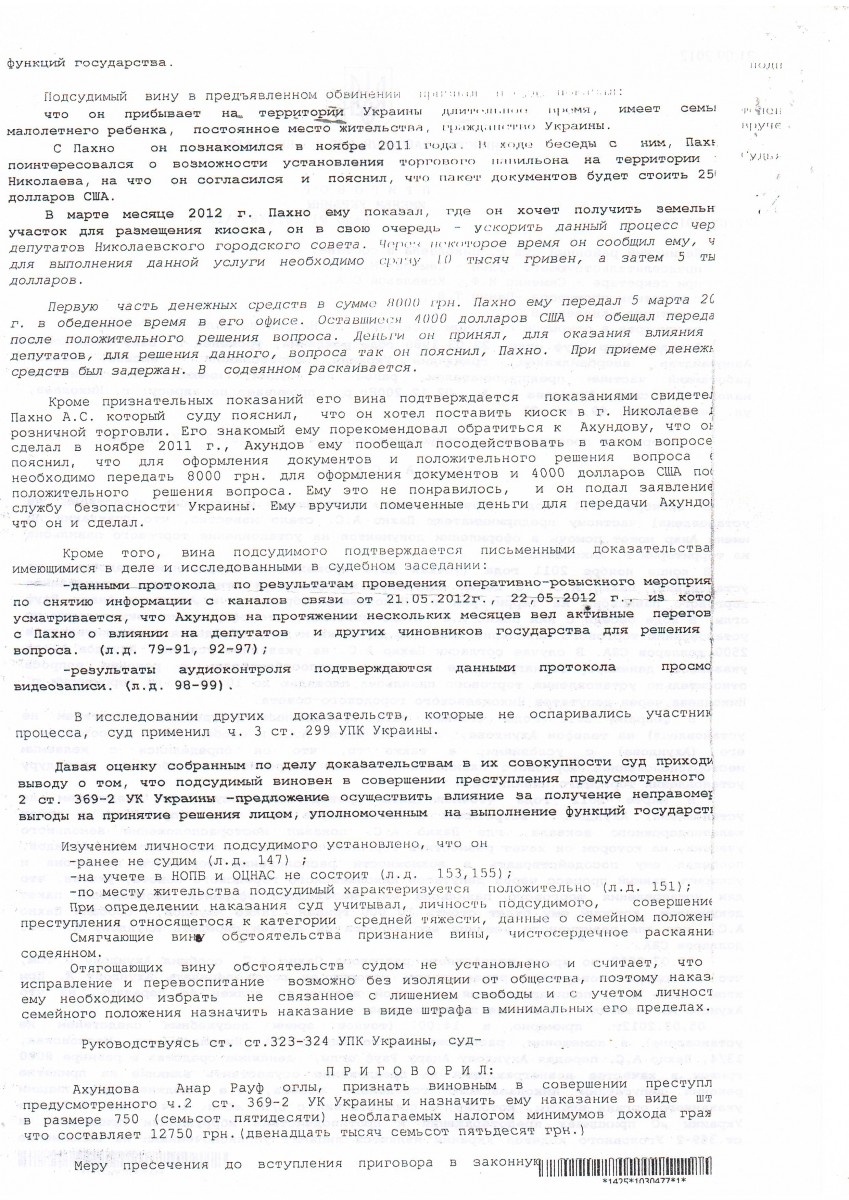 За что конкретно был вынесен обвинительный приговор? Как указано в решении суда, г-н Ахундов Анар Рауф Оглы за денежное вознаграждение в несколько тысяч долларов «пообещал поспособствовать в решении вопроса относительно установления торгового павильона площадью до 10 кв.м на территории г. Николаева через депутатов Николаевского городского совета»…
